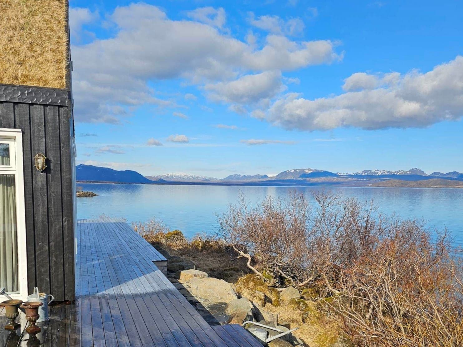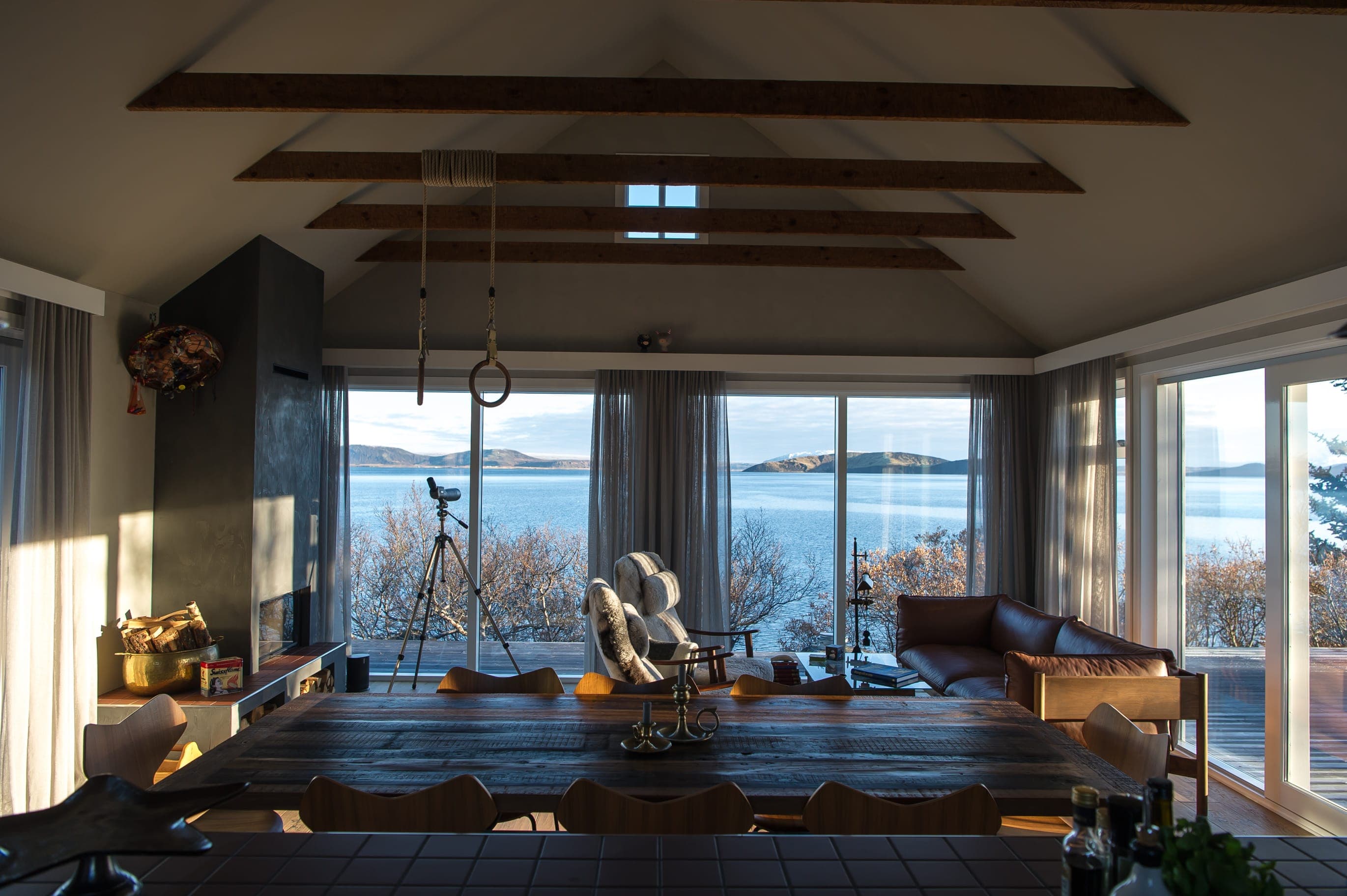 Relax in the hot tub, explore the lake on a fishing trip, or unwind on the private decking with panoramic views of Thingvellir lake. The open-plan layout includes a fully equipped kitchen, dining space for 12, and a cozy living room with a fireplace.