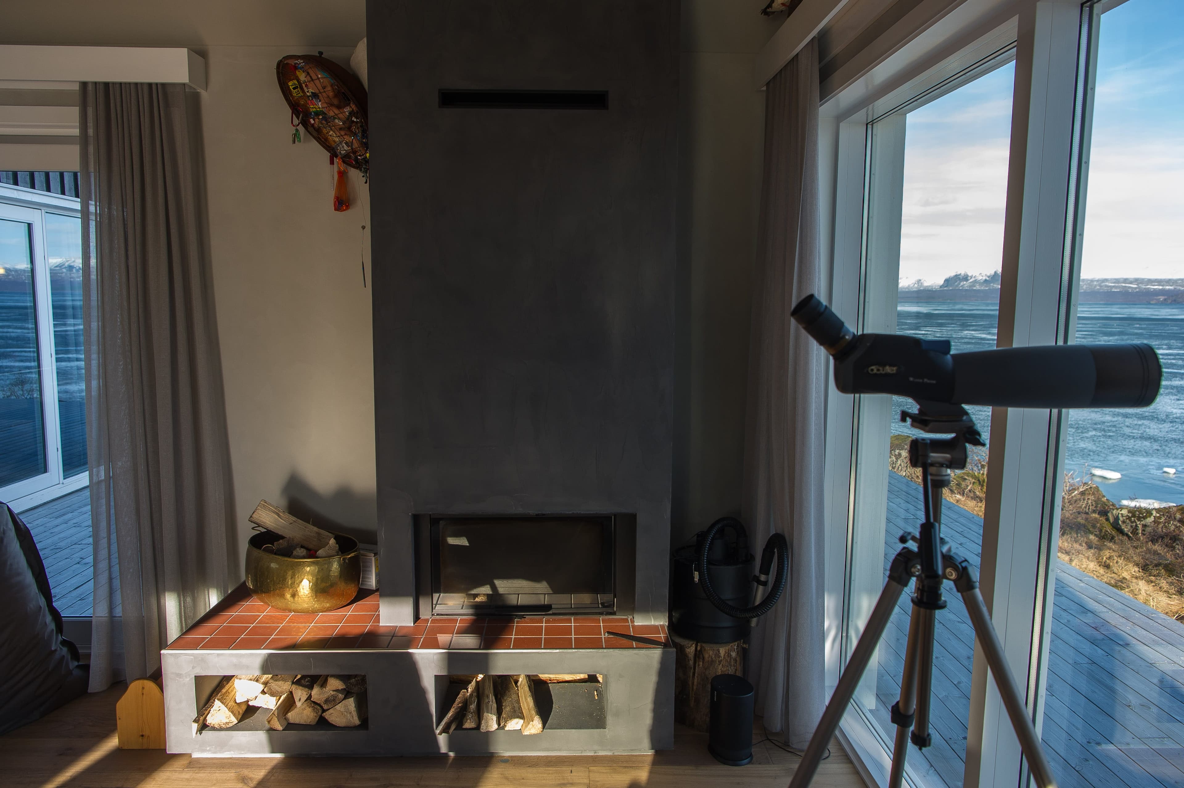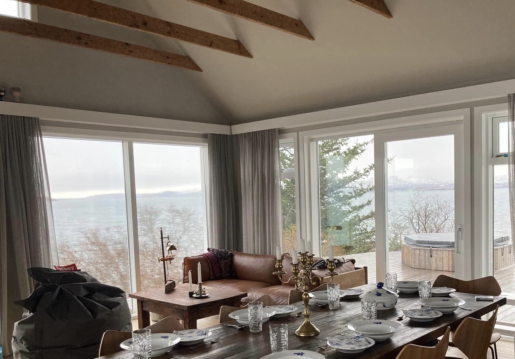 Relax in the hot tub, explore the lake on a fishing trip, or unwind on the private decking with panoramic views of Thingvellir lake. The open-plan layout includes a fully equipped kitchen, dining space for 12, and a cozy living room with a fireplace.
